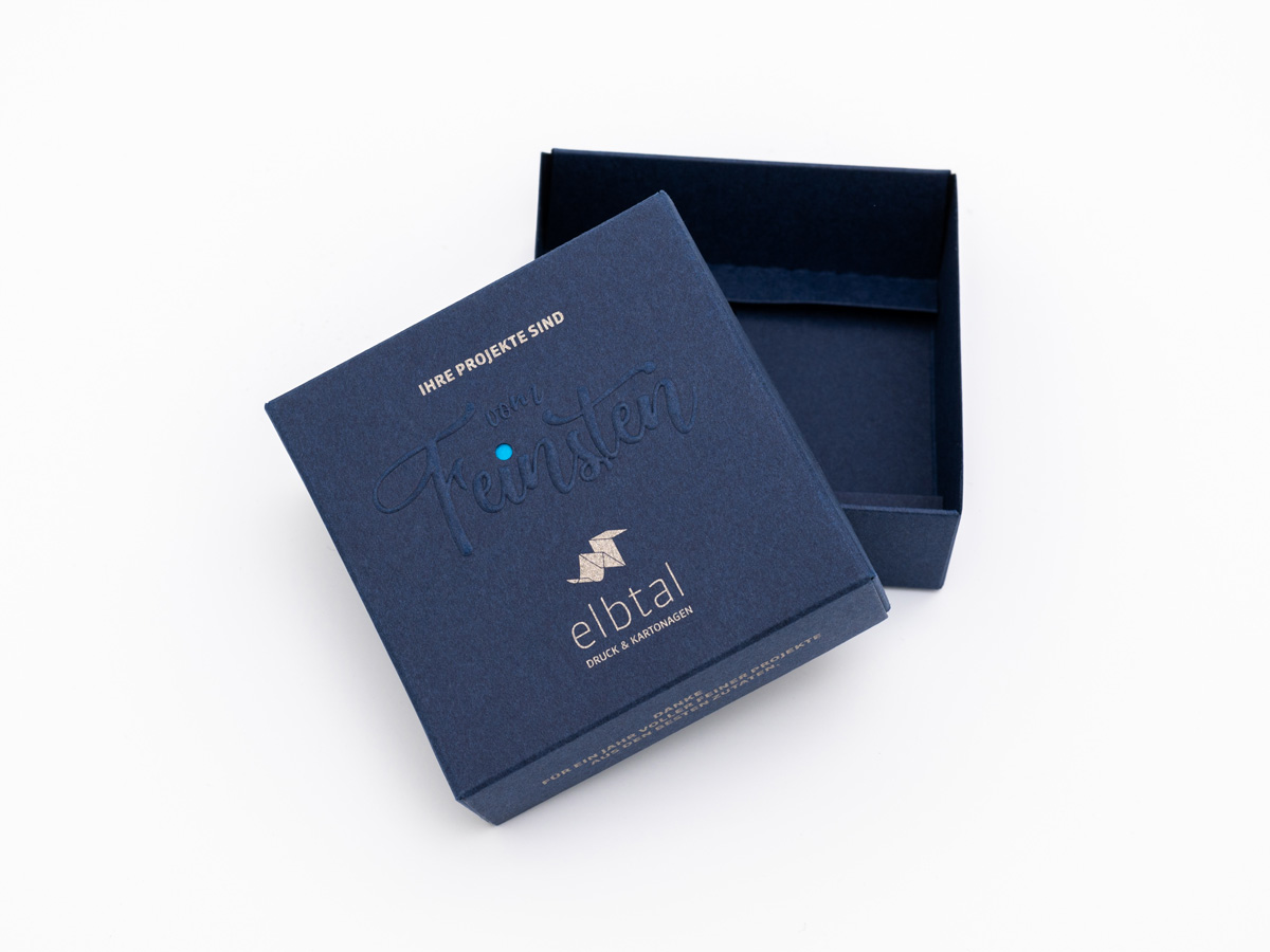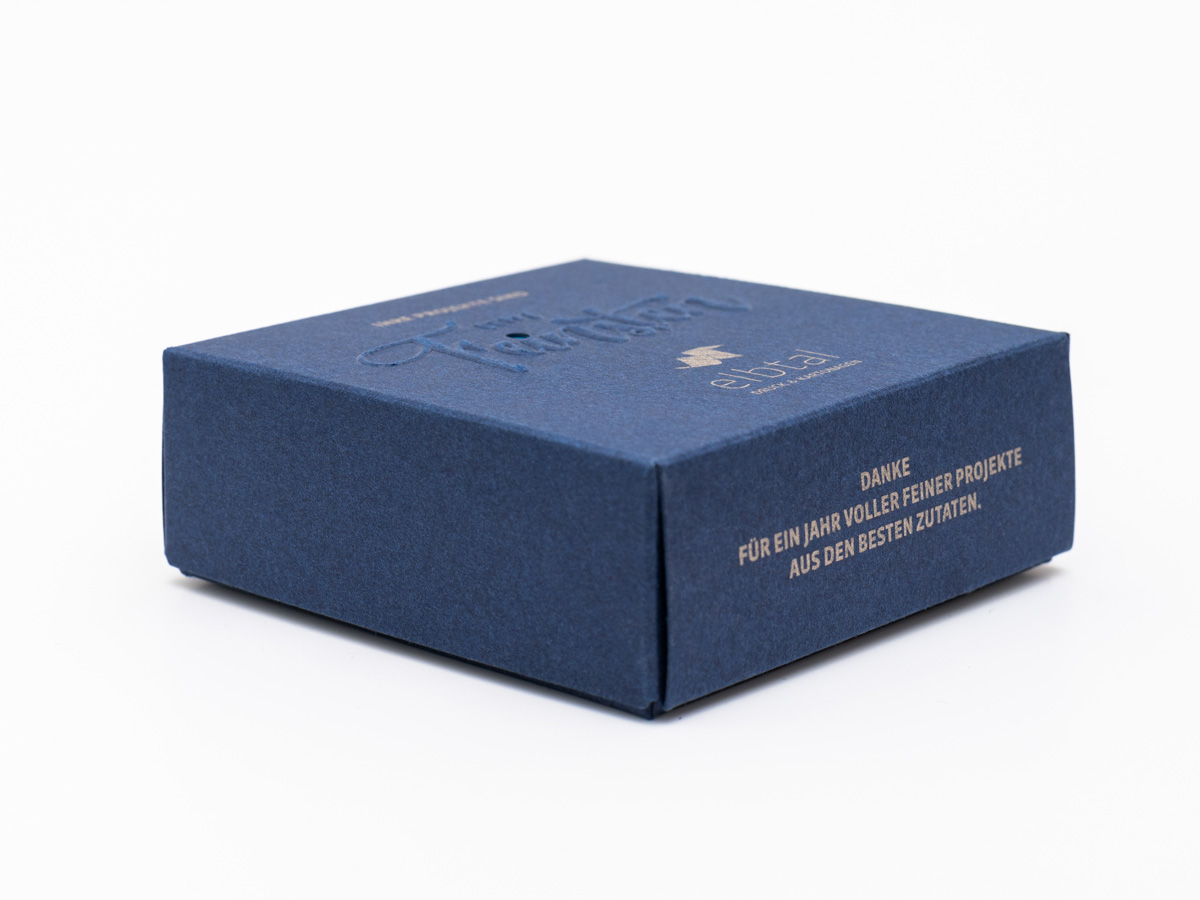 Druck: 1/0-farbig, DeckweißMaterial: Gmund Color 59 dunkelblau 300 g/qmVeredelung: BlindprägungVerarbeitung: stanzen mit Tiefzieheinsatz für Pralinen