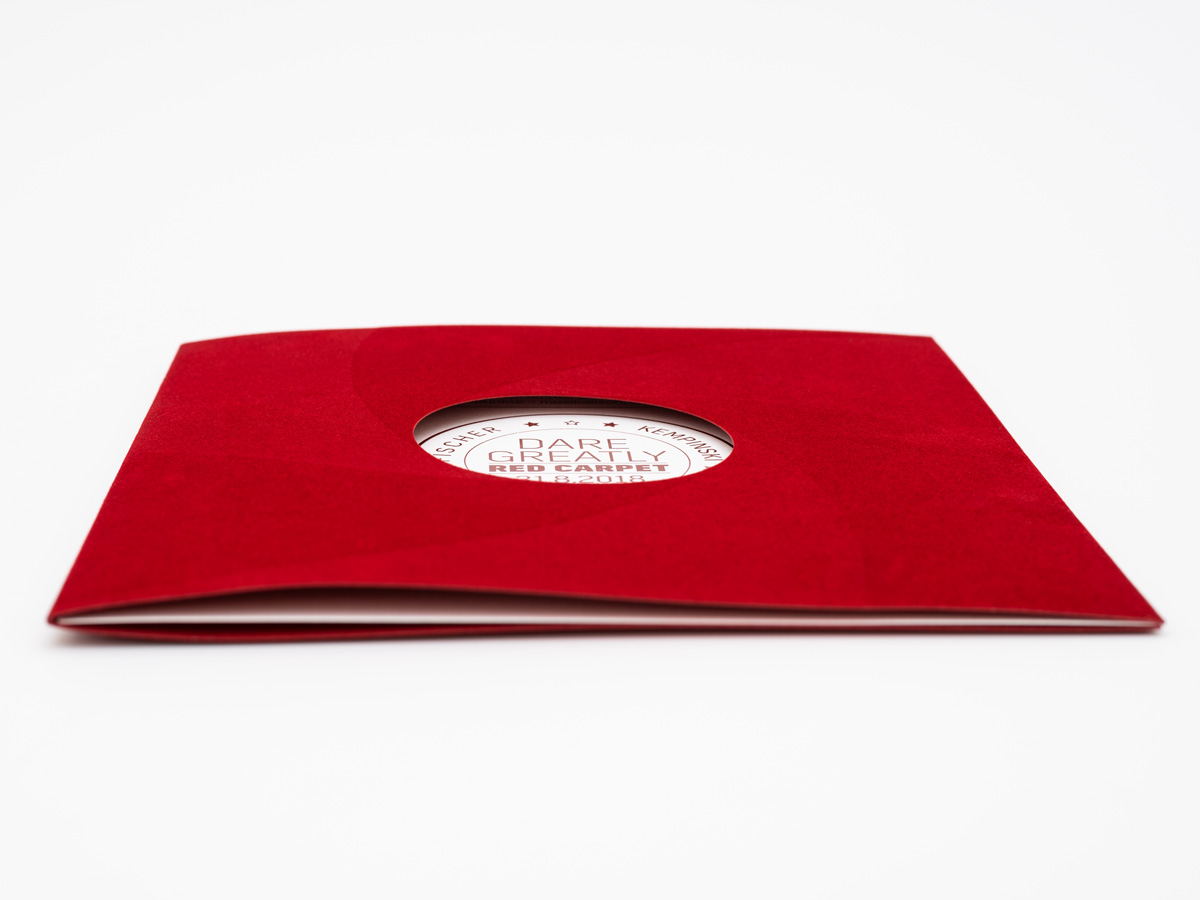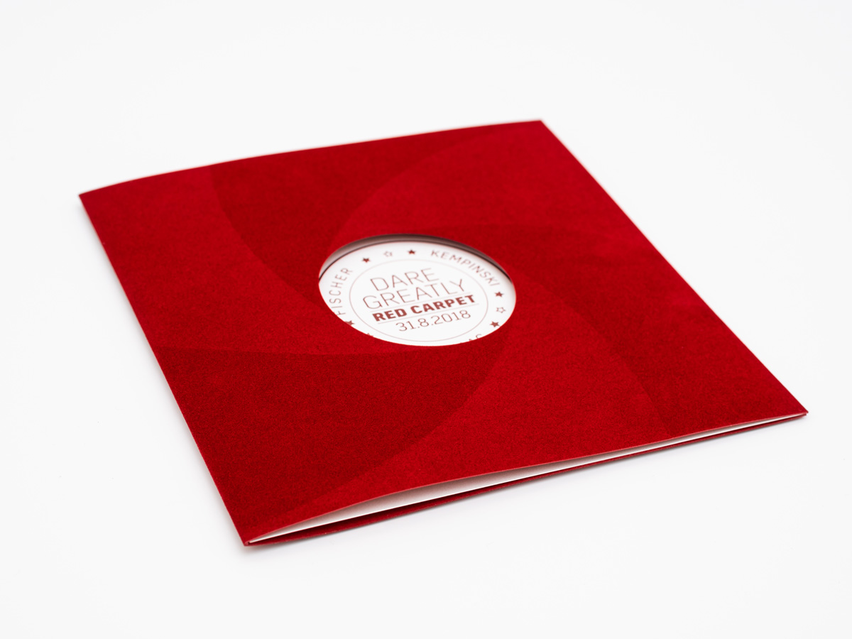 Material: Faltblatt Gmund Kaschmir cloth true red 400 g/qm + Einleger Offset naturweiß 250 g/qm