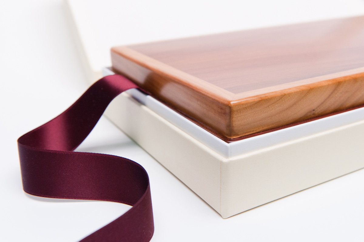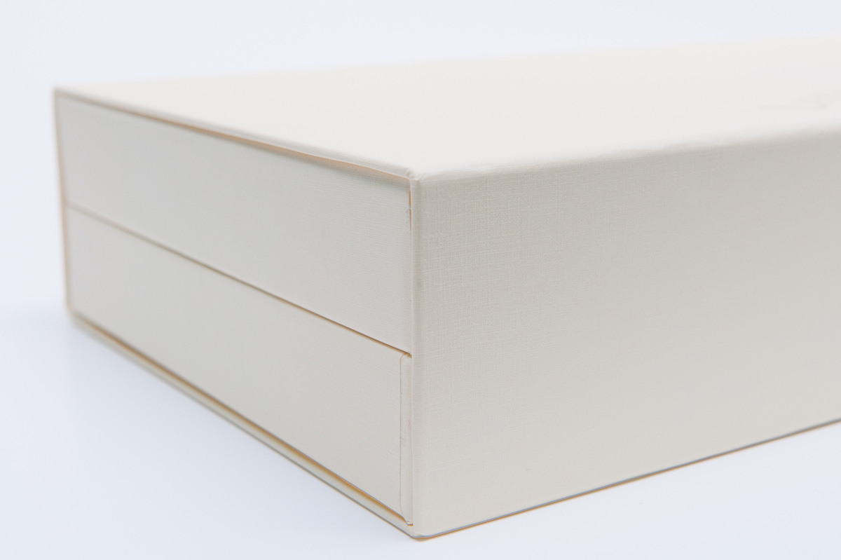 Verarbeitung: Displaykarton und Schuber kaschieren, Innneneinbauten mit Stoff und Seide bekleben, vernähen und in hochwertige Holzverpackung montieren